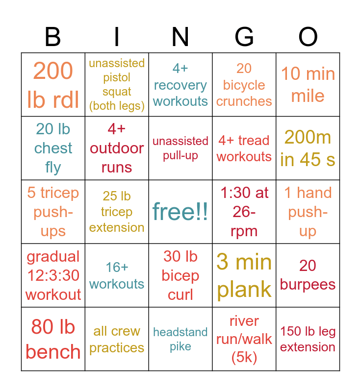 This bingo card has a free space and 24 words: 16+ workouts, all crew practices, unassisted pull-up, 80 lb bench, 10 min mile, 200 lb rdl, 20 lb chest fly, unassisted pistol squat (both legs), 1:30 at 26- rpm, 30 lb bicep curl, 4+ tread workouts, 5 tricep push-ups, 3 min plank, 20 burpees, 4+ outdoor runs, river run/walk (5k), 1 hand push-up, 4+ recovery workouts, 200m in 45 s, 25 lb tricep extension, 150 lb leg extension, gradual 12:3:30 workout, 20 bicycle crunches and headstand pike.