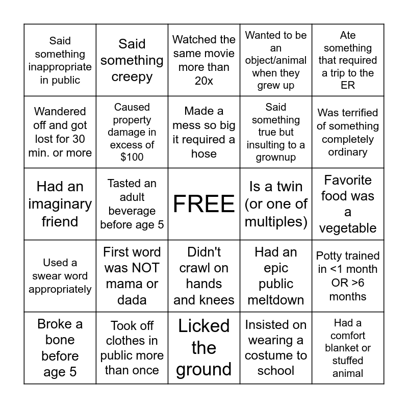 This bingo card has a free space and 24 words: First word was NOT mama or dada, Took off clothes in public more than once, Made a mess so big it required a hose, Broke a bone before age 5, Ate something that required a trip to the ER, Said something inappropriate in public, Wandered off and got lost for 30 min. or more, Said something creepy, Is a twin (or one of multiples), Didn't crawl on hands and knees, Said something true but insulting to a grownup, Had an imaginary friend, Had an epic public meltdown, Potty trained in <1 month OR >6 months, Caused property damage in excess of $100, Insisted on wearing a costume to school, Favorite food was a vegetable, Watched the same movie more than 20x, Was terrified of something completely ordinary, Tasted an adult beverage before age 5, Had a comfort blanket or stuffed animal, Used a swear word appropriately, Wanted to be an object/animal when they grew up and Licked the ground.