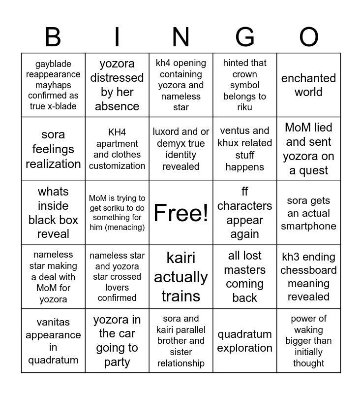This bingo card has a free space and 24 words: nameless star and yozora star crossed lovers confirmed, yozora in the car going to party, luxord and or demyx true identity revealed, vanitas appearance in quadratum, enchanted world, gayblade reappearance mayhaps confirmed as true x-blade, sora feelings realization, yozora distressed by her absence, ff characters appear again, kairi actually trains, ventus and khux related stuff happens, whats inside black box reveal, all lost masters coming back, kh3 ending chessboard meaning revealed, KH4 apartment and clothes customization, quadratum exploration, sora gets an actual smartphone, kh4 opening containing yozora and nameless star, MoM lied and sent yozora on a quest, MoM is trying to get soriku to do something for him (menacing), power of waking bigger than initially thought, nameless star making a deal with MoM for yozora, hinted that crown symbol belongs to riku and sora and kairi parallel brother and sister relationship.