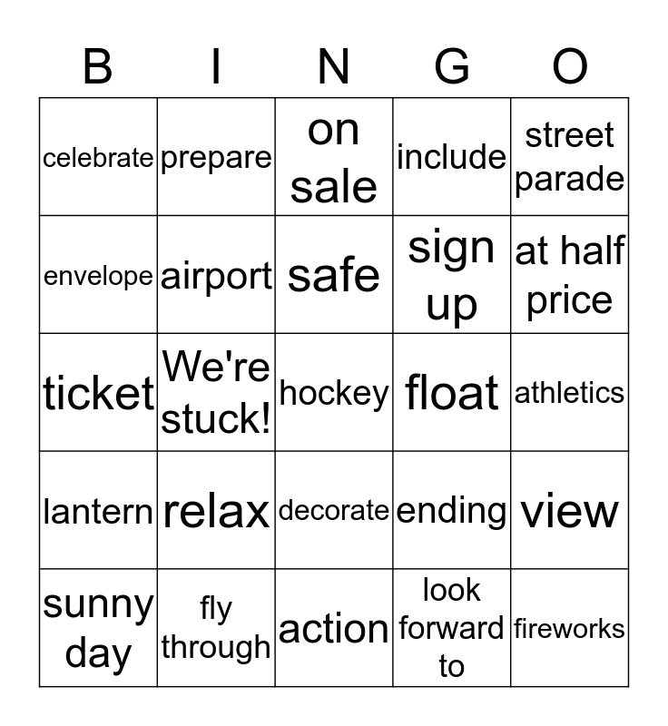 This bingo card has a free space and 24 words: relax, fly through, safe, sunny day, street parade, celebrate, envelope, prepare, float, decorate, sign up, ticket, ending, view, airport, look forward to, athletics, on sale, at half price, We're stuck!, fireworks, lantern, include and action.