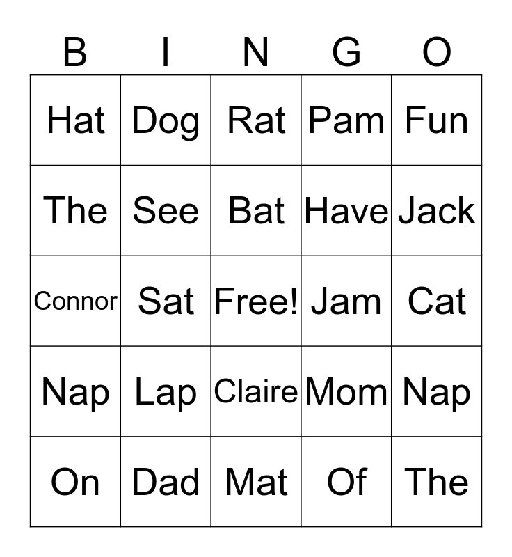 This bingo card has a free space and 24 words: Lap, Dad, Bat, On, Fun, Hat, The, Dog, Jam, Claire, Have, Connor, Mom, Nap, See, Of, Cat, Rat, Jack, Sat, The, Nap, Pam and Mat.