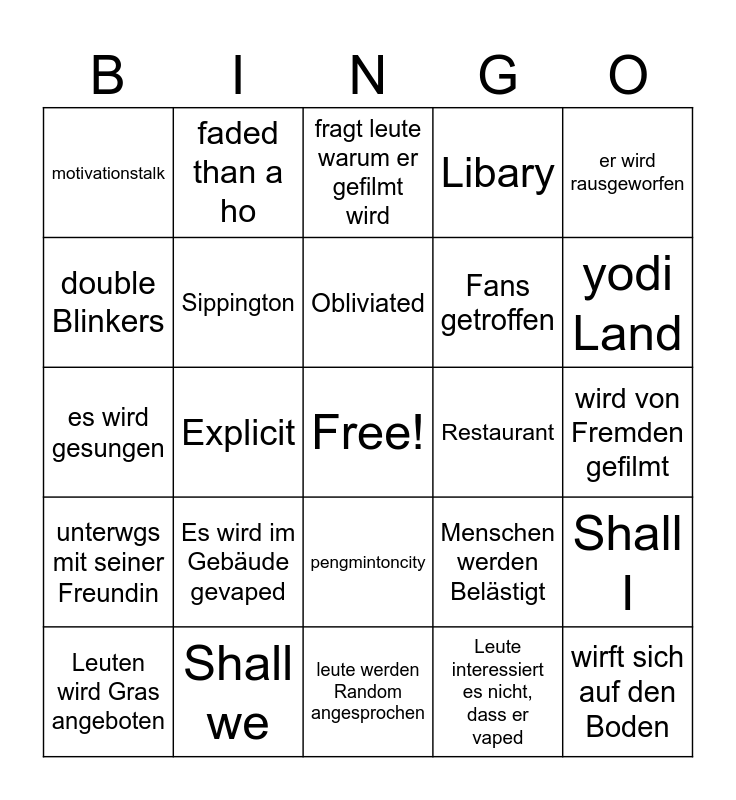 This bingo card has a free space and 24 words: Es wird im Gebäude gevaped, Shall we, Obliviated, Leuten wird Gras angeboten, er wird rausgeworfen, motivationstalk, double Blinkers, faded than a ho, Restaurant, pengmintoncity, Fans getroffen, es wird gesungen, Menschen werden Belästigt, Shall I, Sippington, Leute interessiert es nicht, dass er vaped, wird von Fremden gefilmt, fragt leute warum er gefilmt wird, yodi Land, Explicit, wirft sich auf den Boden, unterwgs mit seiner Freundin, Libary and leute werden Random angesprochen.