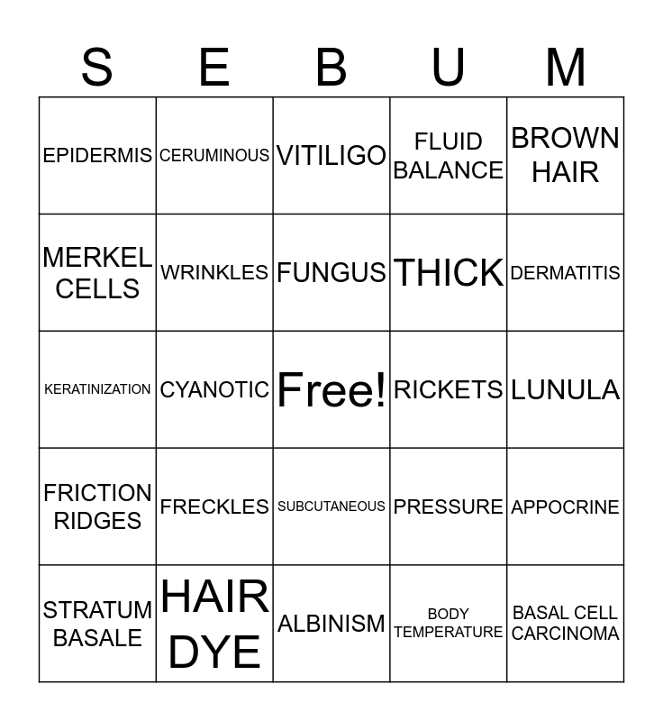 This bingo card has a free space and 32 words: BODY TEMPERATURE, THIN, CYANOTIC, LANGERHANS, FRICTION RIDGES, WRINKLES, BROWN HAIR, APPOCRINE, CERUMINOUS, BODY, FUNGUS, VITILIGO, DERMIS, MELANOMA, RICKETS, STRATUM CORNEUM, STRATUM BASALE, KERATINIZATION, SUBCUTANEOUS, FRECKLES, PRESSURE, ACNE, LUNULA, HAIR DYE, BASAL CELL CARCINOMA, FLUID BALANCE, THICK, MERKEL CELLS, EPIDERMIS, ALBINISM, CAROTENE and DERMATITIS.