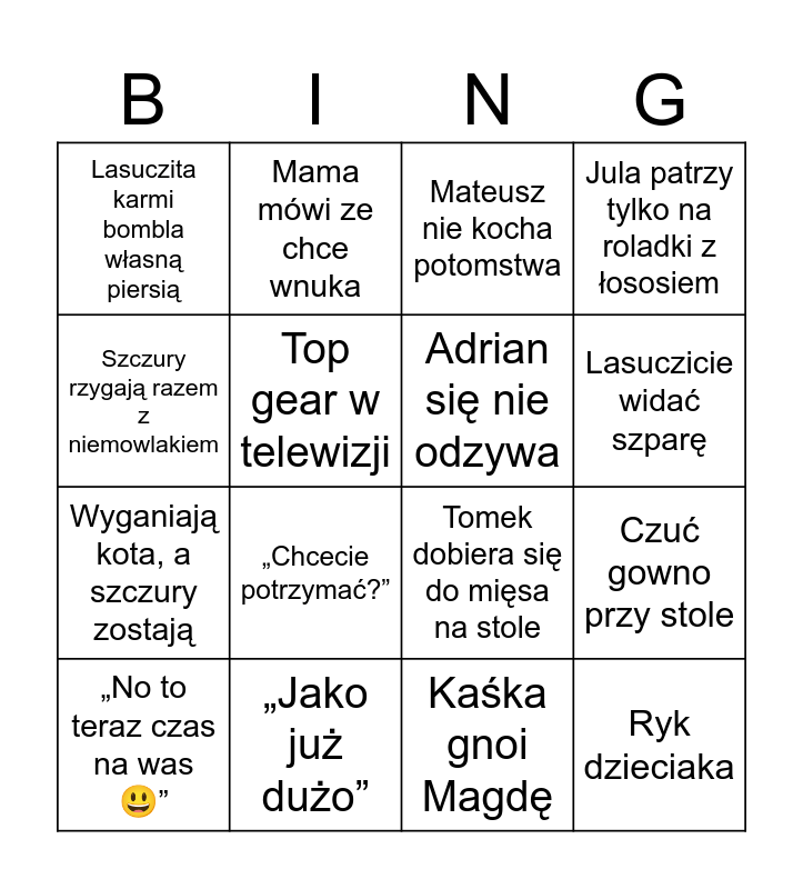 This bingo card has 16 words: „Jako już dużo”, Czuć gowno przy stole, Mateusz nie kocha potomstwa, Lasuczita karmi bombla własną piersią, Wyganiają kota, a szczury zostają, Mama mówi ze chce wnuka, Tomek dobiera się do mięsa na stole, Kaśka gnoi Magdę, Szczury rzygają razem z niemowlakiem, Top gear w telewizji, „No to teraz czas na was 😃”, Jula patrzy tylko na roladki z łososiem, „Chcecie potrzymać?”, Lasuczicie widać szparę, Adrian się nie odzywa and Ryk dzieciaka.