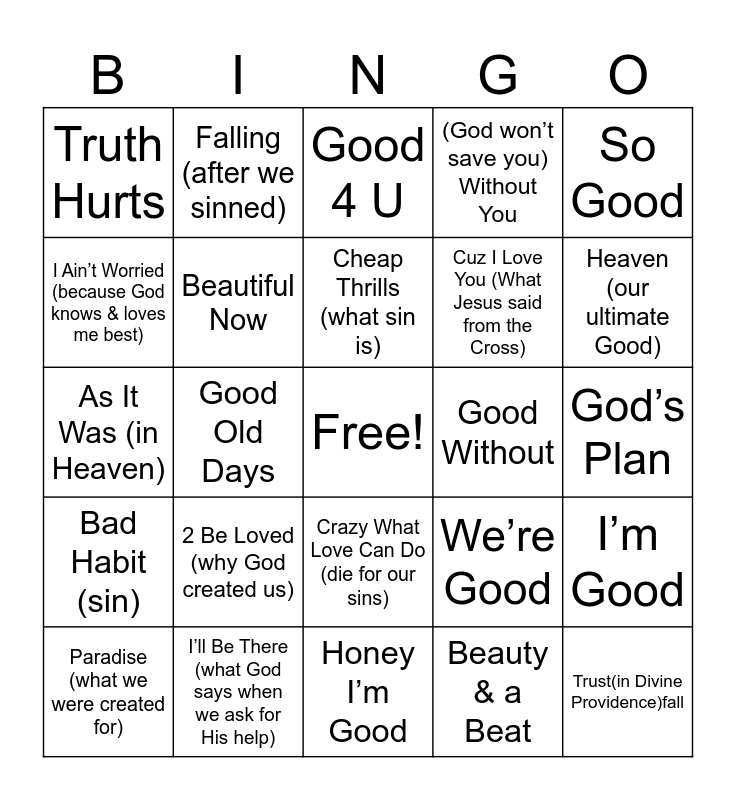This bingo card has a free space and 31 words: Honey I’m Good, Beautiful People, Good Old Days, What Makes You Beautiful, Truth Hurts, Good 4 U, Beautiful Now, We’re Good, Good Without, Beauty & a Beat, God’s Plan, Trust(in Divine Providence)fall, Enemy (led us to break our friendship with God), Cold Heart (us after we sinned), Heaven (our ultimate Good), Special (how God created us), I’m Good, 2 Be Loved (why God created us), Bad Habit (sin), Crazy What Love Can Do (die for our sins), So Good, Holy (Jesus came to be our example), Paradise (what we were created for), Falling (after we sinned), Cuz I Love You (What Jesus said from the Cross), I Ain’t Worried (because God knows & loves me best), (God won’t save you) Without You, As It Was (in Heaven), I’ll Be There (what God says when we ask for His help), Cheap Thrills (what sin is) and (Jesus is) The Greatest.