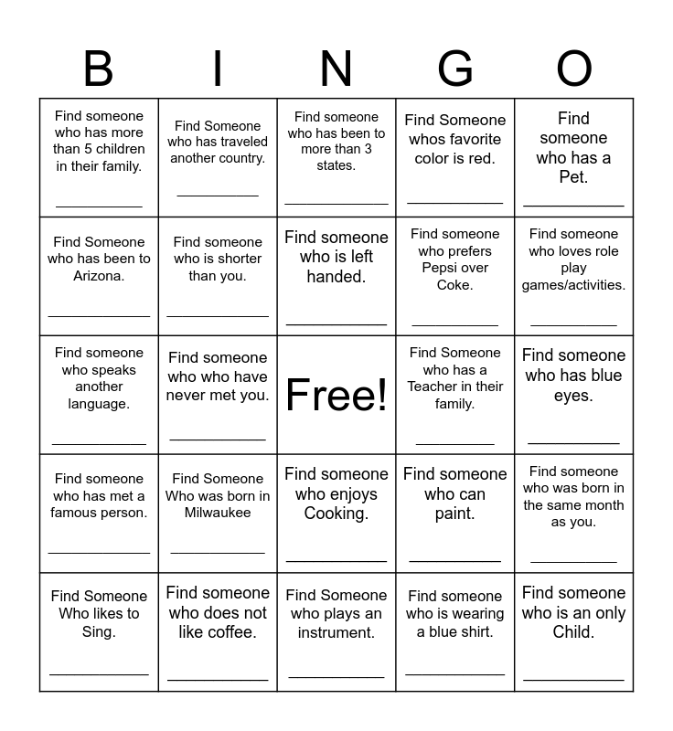 This bingo card has a free space and 25 words: Find Someone Who was born in Milwaukee ____________, Find Someone who plays an instrument. ___________, Find someone who is left handed. ___________, Find Someone Who likes to Sing. ____________, Find someone who has a Pet. ___________, Find someone who has more than 5 children in their family. ___________, Find Someone who has been to Arizona. _____________, Find Someone who has traveled another country. ___________, Find Someone who has a Teacher in their family. __________, Find someone who enjoys Cooking. ___________, Find someone who prefers Pepsi over Coke. ___________, Find someone who speaks another language. ____________, Find someone who can paint. __________, Find someone who was born in the same month as you. ___________, Find someone who is shorter than you. _____________, Find someone who has been on a skateboard. ___________, Find someone who has blue eyes. __________, Find someone who has been to more than 3 states. ______________, Find someone who loves role play games/activities. ___________, Find someone who who have never met you. ___________, Find someone who is an only Child. ___________, Find someone who does not like coffee. ___________, Find someone who has met a famous person. _____________, Find Someone whos favorite color is red. ___________ and Find someone who is wearing a blue shirt. ____________.