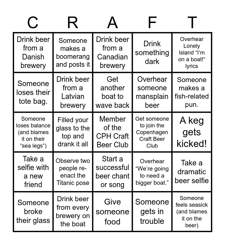 This bingo card has a free space and 29 words: Someone broke their glass, Get someone not on the boat to wave back, Filled your glass to the top and drank it all, Drink beer from a US brewery, Drink beer from a Danish brewery, Drink beer from a Canadian brewery, Drink beer from a Latvian brewery, Observe two people re-enact the Titanic pose, Get someone to join the Copenhagen Craft Beer Club, Drink beer from every brewery on the boat, A keg gets kicked!, Someone feels seasick (and blames it on the beer), Give someone food, Someone gets in trouble, Someone makes a fish-related pun., Spot wildlife in the water!, Start a successful beer chant or song, Take a selfie with a new friend, Overhear Lonely Island “I’m on a boat!” lyrics, Someone loses balance (and blames it on their “sea legs”), Overhear “We’re going to need a bigger boat.”, Someone complains about having the wrong clothes for the weather, Overhear someone mansplain beer, Someone loses their tote bag., Drink something dark, Someone makes a boomerang and posts it, Take a dramatic beer selfie, Get another boat to wave back and Someone spills their beer.