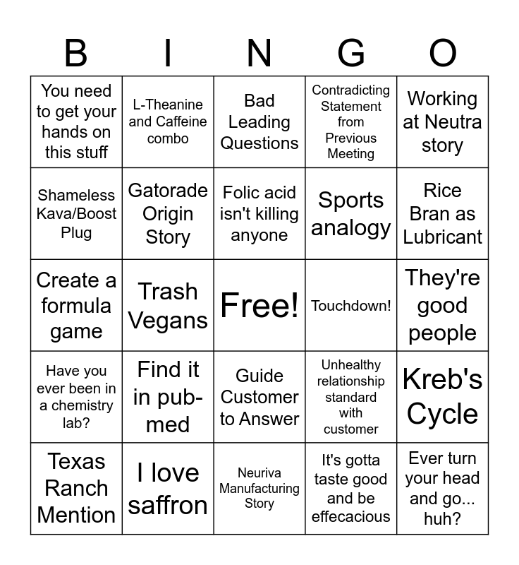 This bingo card has a free space and 28 words: Kreb's Cycle, Come on, you guys know this, Sports analogy, It's gotta taste good and be effecacious, Shameless Kava/Boost Plug, Bad Leading Questions, L-Theanine and Caffeine combo, Have you ever been in a chemistry lab?, Touchdown!, Texas Ranch Mention, Create a formula game, Contradicting Statement from Previous Meeting, I love saffron, Neuriva Manufacturing Story, Rice Bran as Lubricant, Ask Carson, He'll Know, Find it in pub-med, Gatorade Origin Story, Folic acid isn't killing anyone, Guide Customer to Answer, You need to get your hands on this stuff, You're the smartest person in teh room, Ever turn your head and go... huh?, Trash Vegans, They're good people, Unhealthy relationship standard with customer, Working at Neutra story and Our lab is the best.
