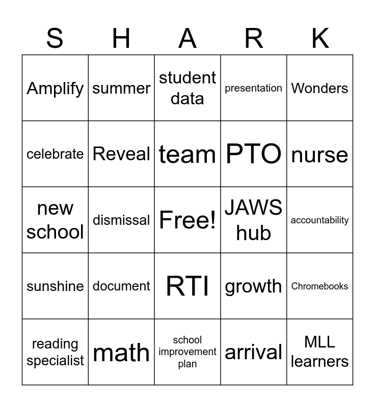 This bingo card has a free space and 24 words: document, math, team, reading specialist, Wonders, Amplify, celebrate, summer, JAWS hub, RTI, PTO, new school, growth, Chromebooks, Reveal, arrival, accountability, student data, nurse, dismissal, MLL learners, sunshine, presentation and school improvement plan.