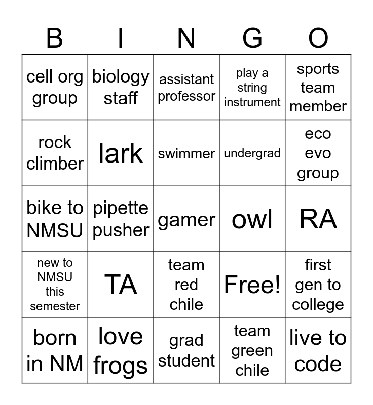 This bingo card has 27 words: Free!, live to code, undergrad, grad student, rock climber, assistant professor, biology staff, new to NMSU this semester, owl, first gen to college, bike to NMSU, play a string instrument, born in NM, love frogs, eco evo group, micro group, lark, swimmer, TA, cell org group, RA, team green chile, pipette pusher, gamer, team red chile, sports team member and grow my own veggies.