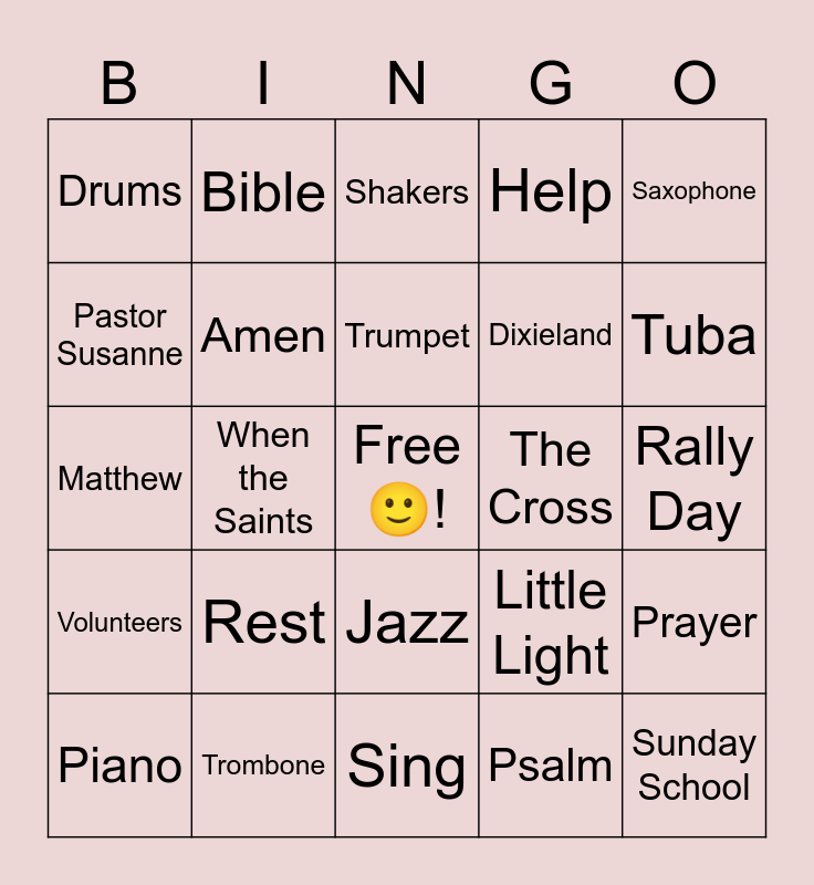 This bingo card has a free space and 24 words: Rest, Trombone, Trumpet, Piano, Saxophone, Drums, Pastor Susanne, Bible, The Cross, Jazz, Dixieland, Matthew, Little Light, Prayer, Amen, Psalm, Rally Day, Shakers, Tuba, When the Saints, Sunday School, Volunteers, Help and Sing.