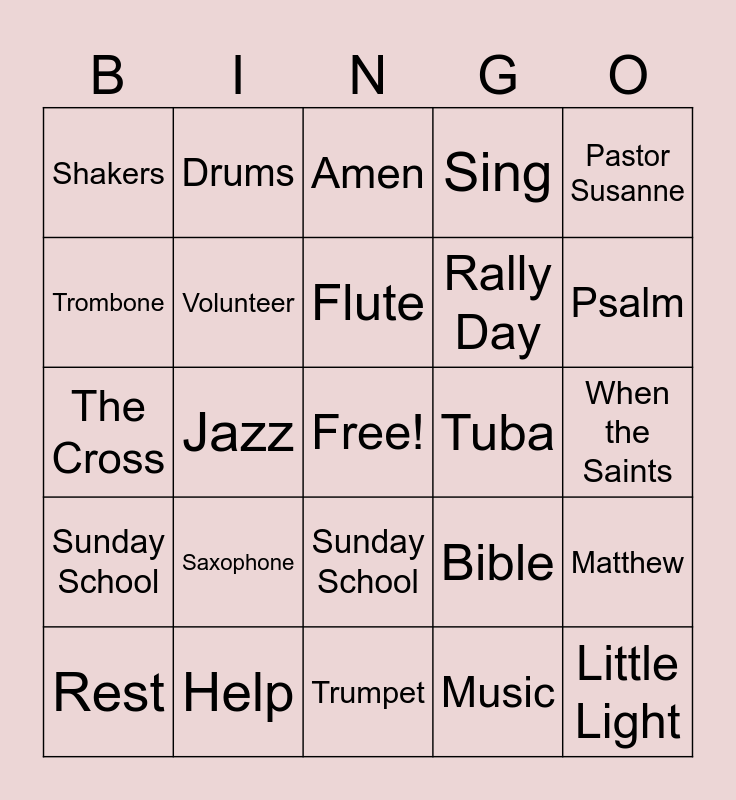This bingo card has a free space and 25 words: Saxophone, Trumpet, Flute, Rest, Pastor Susanne, Shakers, Trombone, Drums, Tuba, Sunday School, Rally Day, The Cross, Bible, Matthew, Volunteer, Prayer, When the Saints, Amen, Psalm, Jazz, Little Light, Help, Sunday School, Sing and Music.