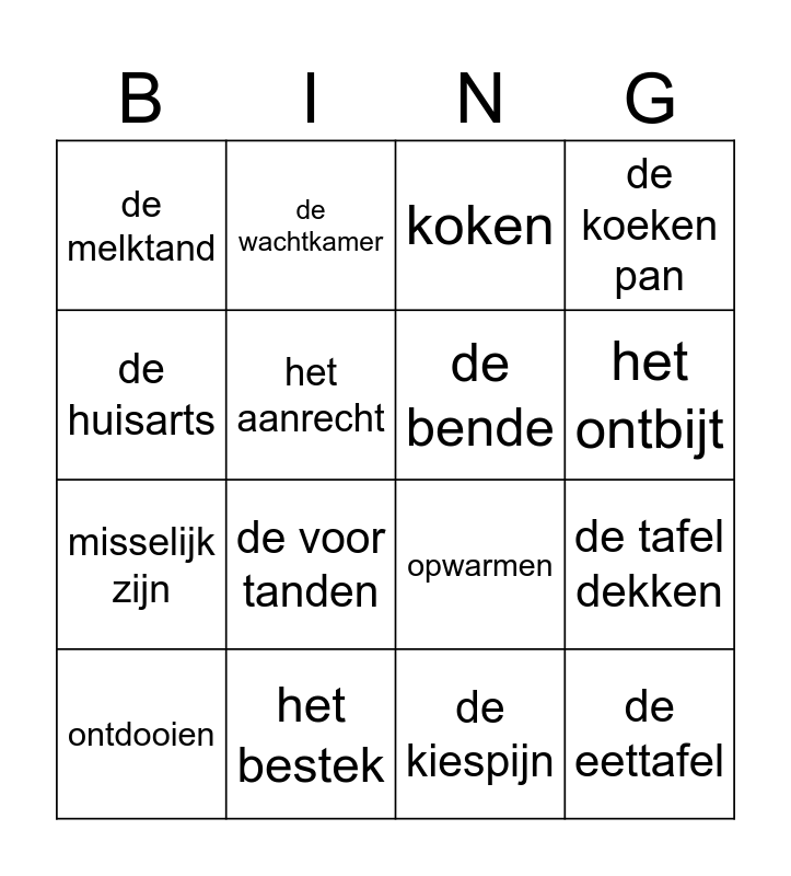This bingo card has 19 words: opwarmen, smakelijk, koken, de eettafel, de tafel dekken, de huisarts, de kiespijn, de melktand, de wachtkamer, misselijk zijn, de voor tanden, het aanrecht, de bende, het bestek, ontdooien, de geur, de koeken pan, het ontbijt and de thermometer.
