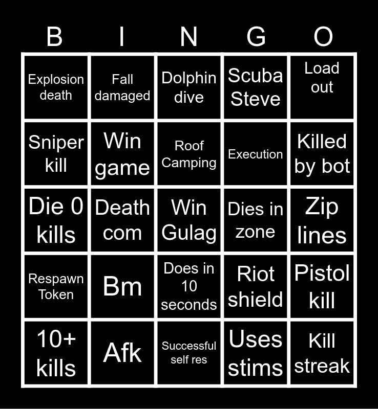 This bingo card has a free space and 24 words: Bm, Afk, Roof Camping, 10+ kills, Load out, Explosion death, Sniper kill, Fall damaged, Dies in zone, Does in 10 seconds, Execution, Die 0 kills, Riot shield, Pistol kill, Win game, Uses stims, Zip lines, Dolphin dive, Killed by bot, Death com, Kill streak, Respawn Token, Scuba Steve and Successful self res.