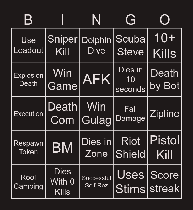 This bingo card has a free space and 24 words: BM, Dies With 0 Kills, AFK, Roof Camping, 10+ Kills, Use Loadout, Explosion Death, Sniper Kill, Fall Damage, Dies in Zone, Dies in 10 seconds, Execution, Riot Shield, Pistol Kill, Win Game, Uses Stims, Zipline, Dolphin Dive, Death by Bot, Death Com, Score streak, Respawn Token, Scuba Steve and Successful Self Rez.