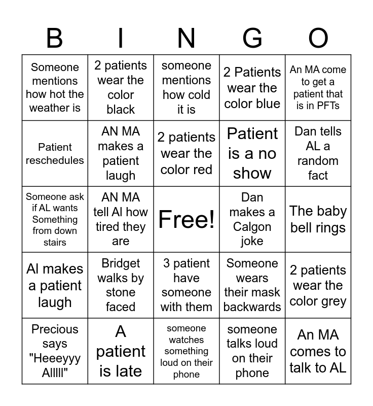 This bingo card has a free space and 29 words: Precious says "Heeeyyy Alllll", Lauryn wears a head band, AN MA tell Al how tired they are, A doctor walks through the clinic without a mask, Someone mentions how hot the weather is, someone mentions how cold it is, AN MA makes a patient laugh, Bridget walks by stone faced, Dan makes a Calgon joke, A patient is late, The baby bell rings, An MA comes to talk to AL, someone watches something loud on their phone, someone talks loud on their phone, Dan tells AL a random fact, Patient ask why they have to wear a mask, 3 patient have someone with them, Al makes a patient laugh, An MA come to get a patient that is in PFTs, Someone ask if AL wants Something from down stairs, Someone wears their mask backwards, Someone stands at the front door looking for a mask, Patient is a no show, Patient reschedules, 2 Patients wear the color blue, 2 patients wear the color black, 2 patients wear the color grey, 2 patients wear the color red and 2 patients wear the color pink.
