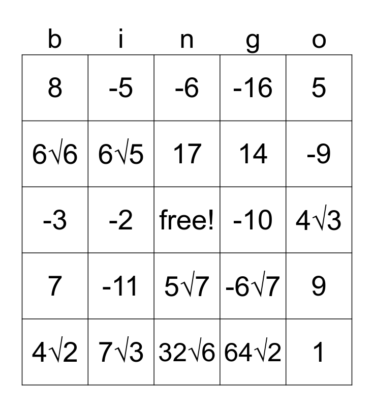 This bingo card has a free space and 29 words: 4√2, -4, -2, -25√6, 8, -6, 6√5, -11, -10, 7√3, 4√3, 1, 32√6, 64√2, -9, 3, 5√7, 7, 5, -3, -6√7, 4, 14, 6√6, -16, -5, 9, 17 and 19.