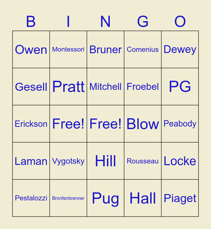This bingo card has a free space and 24 words: Vygotsky, Bronfenbrenner, Mitchell, Pestalozzi, Dewey, Owen, Gesell, Montessori, Blow, Hill, Froebel, Erickson, Rousseau, Locke, Pratt, Hall, Peabody, Bruner, PG, Free!, Piaget, Laman, Comenius and Pug.