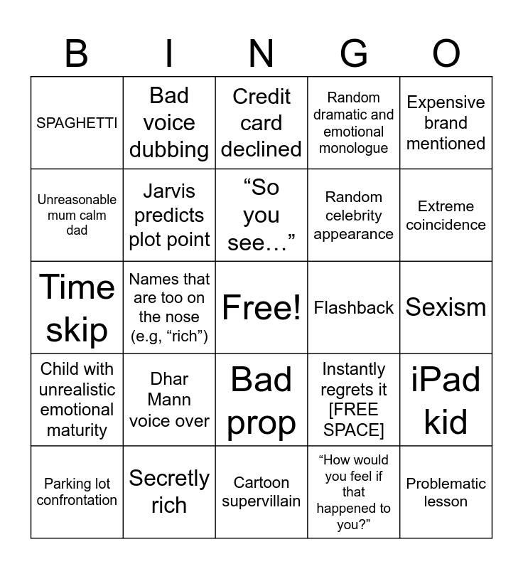 This bingo card has a free space and 25 words: Dhar Mann voice over, Cartoon supervillain, “So you see…”, Parking lot confrontation, Expensive brand mentioned, SPAGHETTI, Unreasonable mum calm dad, Bad voice dubbing, Flashback, Bad prop, Random celebrity appearance, Time skip, Instantly regrets it [FREE SPACE], iPad kid, Jarvis predicts plot point, DHAR CAR, Sexism, Credit card declined, Extreme coincidence, Names that are too on the nose (e.g, “rich”), Problematic lesson, Secretly rich, Child with unrealistic emotional maturity, Random dramatic and emotional monologue and “How would you feel if that happened to you?”.