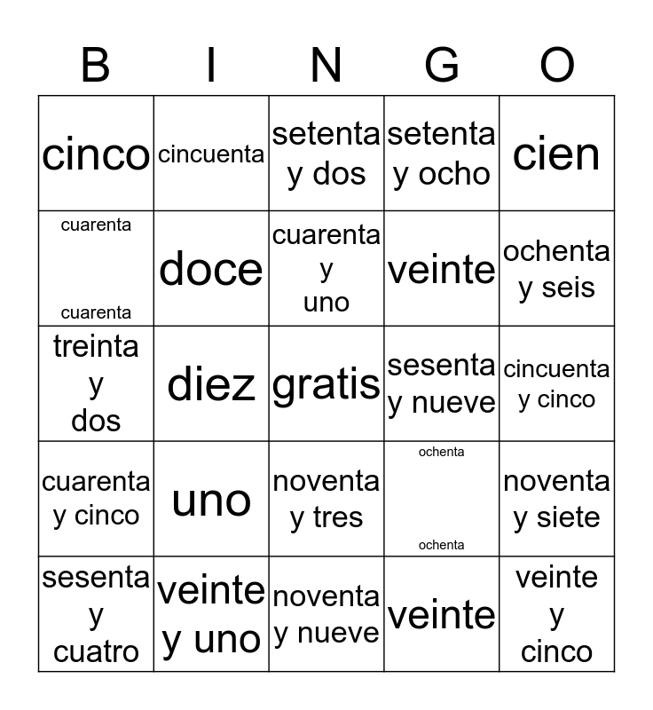 This bingo card has a free space and 24 words: uno, veinte y uno, cuarenta y uno, sesenta y cuatro, cien, cinco, cuarenta cuarenta, cincuenta, sesenta y nueve, noventa y tres, veinte, treinta y dos, ochenta ochenta, noventa y siete, doce, veinte, cincuenta y cinco, setenta y dos, ochenta y seis, diez, veinte y cinco, cuarenta y cinco, setenta y ocho and noventa y nueve.