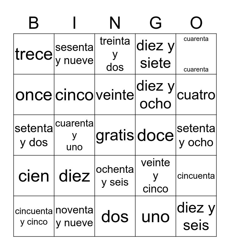 This bingo card has a free space and 32 words: uno, veinte y uno, cuarenta y uno, sesenta y cuatro, cien, cinco, cuarenta cuarenta, cincuenta, sesenta y nueve, noventa y tres, veinte, treinta y dos, ochenta ochenta, noventa y siete, doce, veinte, cincuenta y cinco, setenta y dos, ochenta y seis, diez, veinte y cinco, cuarenta y cinco, setenta y ocho, noventa y nueve, diez y seis, diez y siete, diez y ocho, once, trece, dos, tres and cuatro.