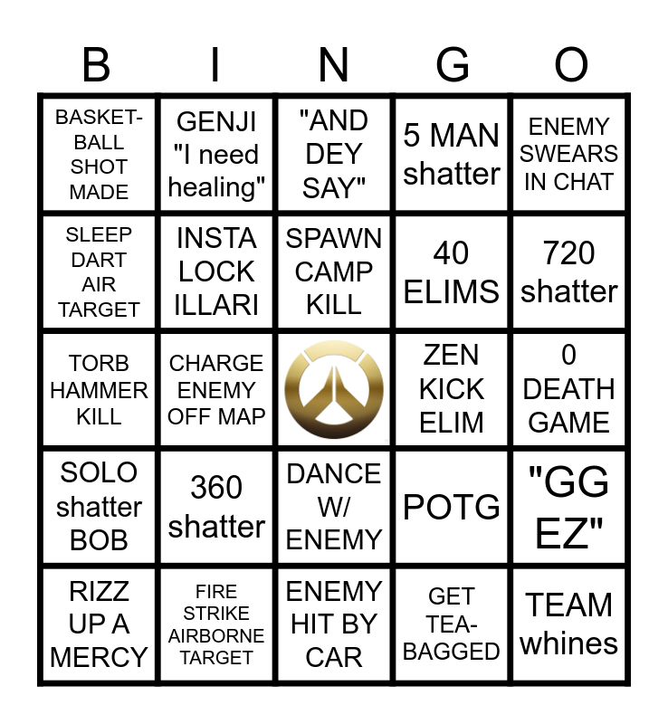 This bingo card has a free space and 24 words: RIZZ UP A MERCY, 360 shatter, SPAWN CAMP KILL, GET TEA- BAGGED, ENEMY SWEARS IN CHAT, BASKET- BALL SHOT MADE, GENJI "I need healing", "AND DEY SAY", ZEN KICK ELIM, 0 DEATH GAME, TORB HAMMER KILL, INSTA LOCK ILLARI, POTG, "GG EZ", SLEEP DART AIR TARGET, FIRE STRIKE AIRBORNE TARGET, ENEMY HIT BY CAR, 5 MAN shatter, 720 shatter, SOLO shatter BOB, CHARGE ENEMY OFF MAP, DANCE W/ ENEMY, 40 ELIMS and TEAM whines.