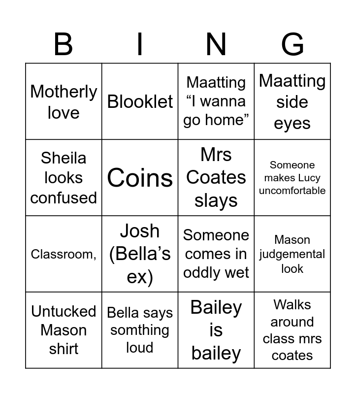 This bingo card has 16 words: Bella says somthing loud, Mason judgemental look, Maatting “I wanna go home”, Motherly love, Classroom,, Blooklet, Someone comes in oddly wet, Bailey is bailey, Sheila looks confused, Coins, Untucked Mason shirt, Maatting side eyes, Josh (Bella’s ex), Someone makes Lucy uncomfortable, Mrs Coates slays and Walks around class mrs coates.
