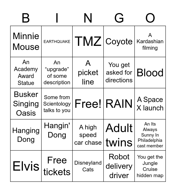 This bingo card has a free space and 25 words: Hangin' Dong, Disneyland Cats, A picket line, Elvis, A Kardashian filming, Minnie Mouse, An Academy Award Statue, EARTHQUAKE, RAIN, A high speed car chase, You get asked for directions, Busker Singing Oasis, Adult twins, An Its Always Sunny In Philadelphia cast member, An “upgrade” of some description, 20k steps, A Space X launch, TMZ, Blood, Some from Scientology talks to you, You get the Jungle Cruise hidden map, Free tickets, Hanging Dong, Coyote and Robot delivery driver.