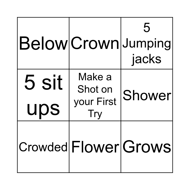 This bingo card has a free space and 8 words: Shower, 5 Jumping jacks, Crown, Crowded, Below, Grows, 5 sit ups and Flower.