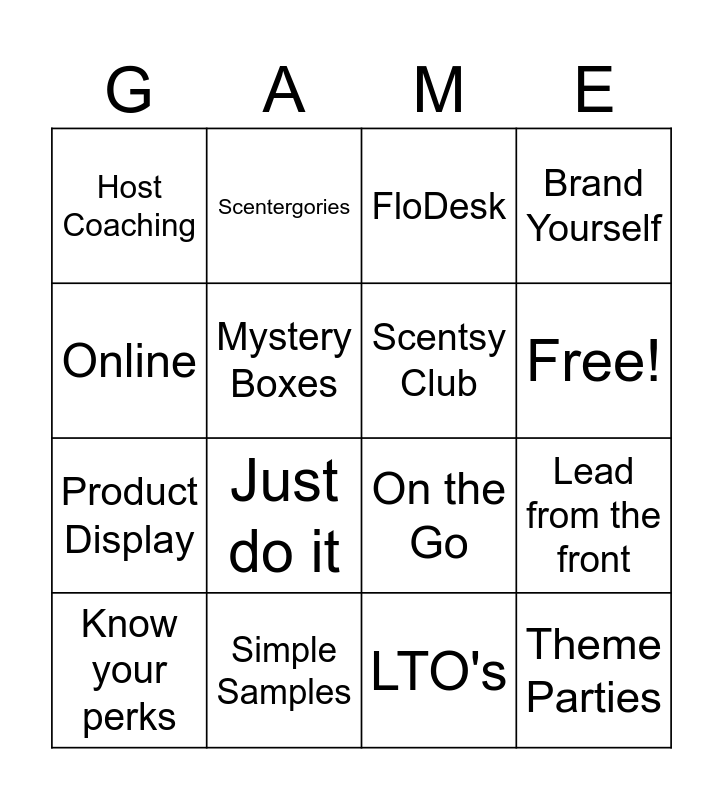 This bingo card has 35 words: Post Covid, Canva, Dan the Man, Scentsy Club, Plan Your Month, Brand Yourself, Mystery Boxes, Theme Boxes, Free!, On Location, On the Go, Online, Booking Blitz, Shopping Link, Host Coaching, Simple Samples, Crinkle Cutter, Lead from the front, Theme Parties, Know your perks, Follow Up, Consistency, Earn The Incentive, Games Night, FloDesk, Just do it, Happy Mail, Halloween, Product Display, LTO's, Afternoon Tea, Wax Stacks, Bingo, Scentergories and PictionScentsy.