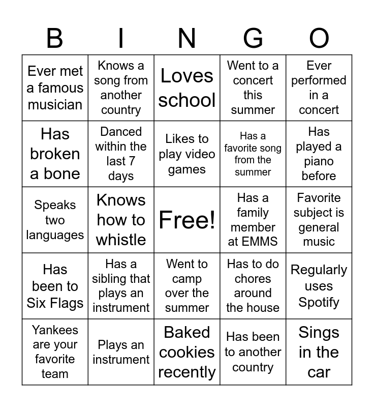 This bingo card has a free space and 24 words: Has a sibling that plays an instrument, Plays an instrument, Likes to play video games, Yankees are your favorite team, Ever performed in a concert, Ever met a famous musician, Has broken a bone, Knows a song from another country, Has a family member at EMMS, Went to camp over the summer, Has a favorite song from the summer, Speaks two languages, Has to do chores around the house, Regularly uses Spotify, Danced within the last 7 days, Has been to another country, Favorite subject is general music, Loves school, Has played a piano before, Knows how to whistle, Sings in the car, Has been to Six Flags, Went to a concert this summer and Baked cookies recently.
