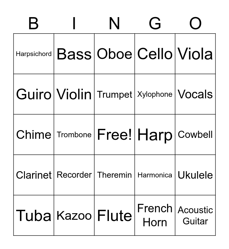 This bingo card has a free space and 49 words: Piano, Acoustic Guitar, Electric Guitar, Flute, Recorder, Accordion, Bass, Conga, Guiro, Vihuela, Violin, Cello, Ukulele, Harmonica, Drums, Organ, Trumpet, Harp, Bagpipes, Viola, Trombone, French Horn, Harpsichord, Xylophone, Marimba, Vocals, Tuba, Cymbals, Theremin, Clarinet, Bongos, Pipa, Erhu, Guitarron, Kazoo, Saxophone, Banjo, Maracas, Cowbell, Tambourine, Conch, Melodica, Gong, Bell, Chime, Oboe, Basson, Ocarina and Oud.