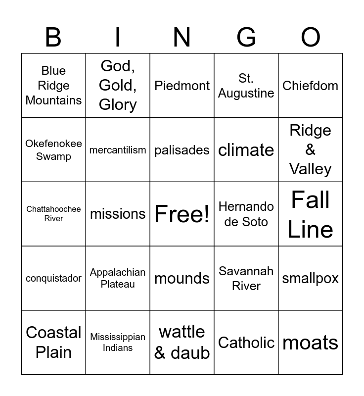 This bingo card has a free space and 24 words: Appalachian Plateau, Mississippian Indians, palisades, Coastal Plain, Chiefdom, Blue Ridge Mountains, Okefenokee Swamp, God, Gold, Glory, Hernando de Soto, mounds, climate, Chattahoochee River, Savannah River, smallpox, mercantilism, Catholic, Fall Line, Piedmont, Ridge & Valley, missions, moats, conquistador, St. Augustine and wattle & daub.