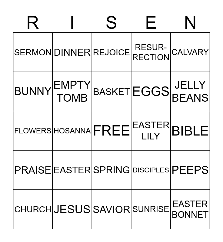 This bingo card has a free space and 24 words: EASTER, JESUS, BASKET, CHURCH, CALVARY, SERMON, BUNNY, DINNER, EASTER LILY, SPRING, EGGS, FLOWERS, DISCIPLES, PEEPS, EMPTY TOMB, SUNRISE, BIBLE, REJOICE, JELLY BEANS, HOSANNA, EASTER BONNET, PRAISE, RESUR-RECTION and SAVIOR.