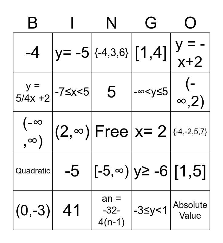 This bingo card has a free space and 24 words: -5, 41, 5, (0,-3), y = -x+2, -4, y = 5/4x +2, y= -5, x= 2, [-5,∞), -∞<y≤5, (-∞ ,∞), y≥ -6, [1,5], -7≤x<5, -3≤y<1, {-4,-2,5,7}, {-4,3,6}, (-∞,2), (2,∞), Absolute Value, Quadratic, [1,4] and an = -32-4(n-1).