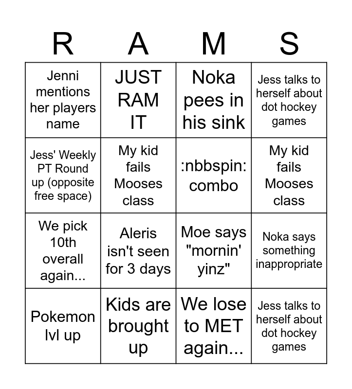 This bingo card has 19 words: Moe says "mornin' yinz", Another player sets a league record (again), Noka pees in his sink, Jess talks to herself about dot hockey games, Noka says something inappropriate, Jess' Weekly PT Round up (opposite free space), We lose to MET again..., Jenni mentions her players name, JUST RAM IT, We pick 10th overall again..., Aleris isn't seen for 3 days, My kid fails Mooses class, :nbbspin: combo, Kids are brought up, Pokemon lvl up, WPG snipes another NBB, Jess talks to herself about dot hockey games, My kid fails Mooses class and WPG snipes another NBB.