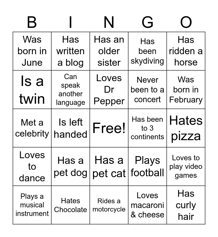 This bingo card has a free space and 31 words: Rides a motorcycle, Has a younger brother, Is left handed, Does yoga, Was born in June, Has an older sister, Can speak another language, Plays football, Has been to 3 continents, Loves macaroni & cheese, Hates pizza, Has curly hair, Has a beard, Is an only child, Was born in February, Never been on an airplane, Loves to play video games, Has a pet dog, Loves to dance, Has a pet cat, Has ridden a horse, Has made a YouTube video, Plays a musical instrument, Has written a blog, Never been to a concert, Is a twin, Has been skydiving, Met a celebrity, Hates Chocolate, Loves Dr Pepper and Likes to Garden.