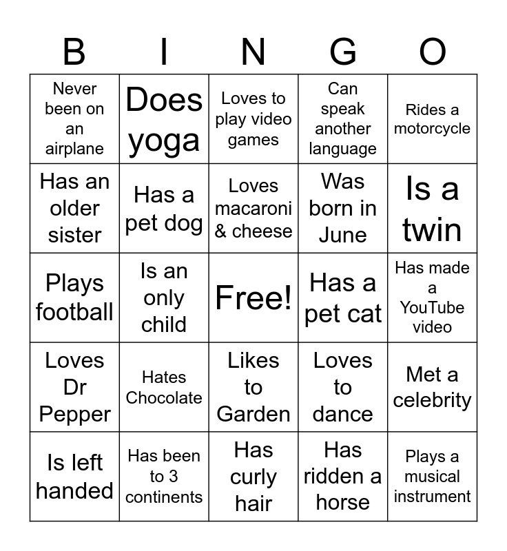 This bingo card has a free space and 31 words: Has curly hair, Has a beard, Is an only child, Was born in February, Never been on an airplane, Loves to play video games, Has a pet dog, Loves to dance, Has a pet cat, Has ridden a horse, Has made a YouTube video, Plays a musical instrument, Has written a blog, Never been to a concert, Is a twin, Has been skydiving, Met a celebrity, Hates Chocolate, Loves Dr Pepper, Likes to Garden, Rides a motorcycle, Has a younger brother, Is left handed, Does yoga, Was born in June, Has an older sister, Can speak another language, Plays football, Has been to 3 continents, Loves macaroni & cheese and Hates pizza.