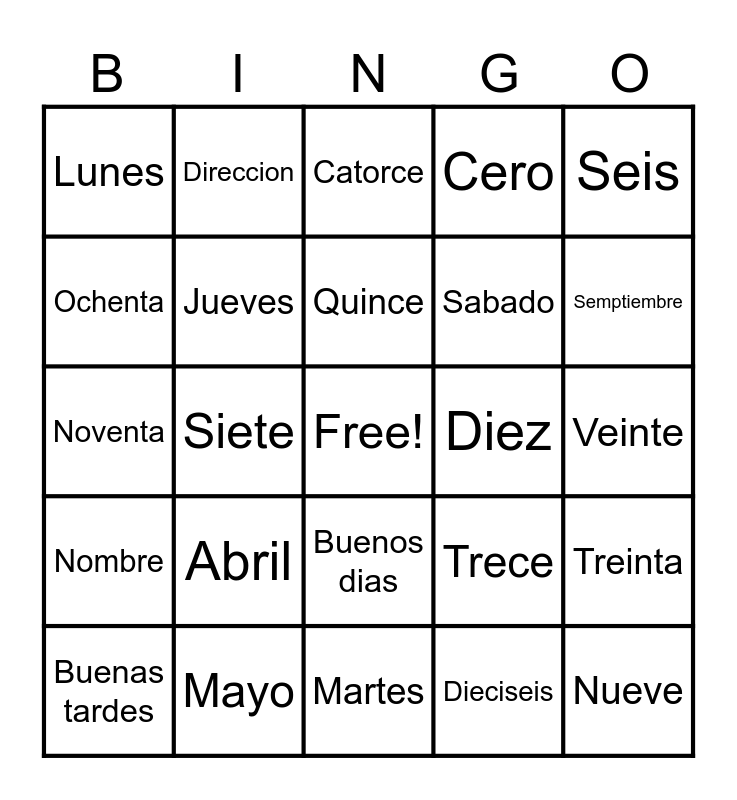 This bingo card has a free space and 55 words: Buenos Dias, Buenas tardes, Buenas noches, Lunes, Martes, Miercoles, Jueves, Viernes, Sabado, Domingo, Cero, Uno, Dos, Tres, Cuatro, Cinco, Seis, Siete, Ocho, Nueve, Diez, Once, Trece, Catorce, Hola, Quince, Dieciseis, Diecisiete, Veinte, Treinta, Cuarenta, Cincuenta, Sesenta, Setenta, Ochenta, Noventa, Cien, Nombre, Apellido, Fecha de Nacimiento, Direccion, Enero, Febrero, Marzo, Abril, Mayo, Junio, Julio, Agosto, Semptiembre, Octubre, Noviembre, Diciembre, Buenos dias and Buenas Tardes.