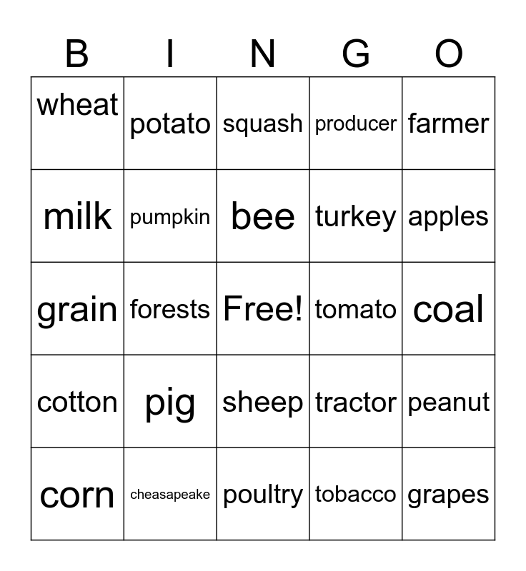This bingo card has a free space and 24 words: pig, cheasapeake, bee, corn, farmer, wheat, milk, potato, tomato, sheep, turkey, grain, tractor, peanut, pumpkin, tobacco, coal, squash, apples, forests, grapes, cotton, producer and poultry.