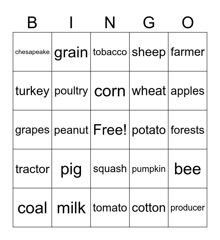 This bingo card has a free space and 24 words: pig, milk, corn, coal, farmer, chesapeake, turkey, grain, potato, squash, wheat, grapes, pumpkin, bee, poultry, cotton, forests, tobacco, apples, peanut, producer, tractor, sheep and tomato.