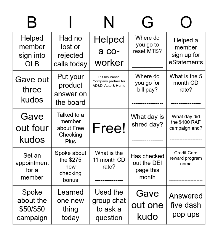 This bingo card has a free space and 29 words: Spoke about the $50/$50 campaign, Answered one dash pop up, Talked to a member about Free Checking Plus, Completed a CBSI referral, Helped member sign into OLB, Helped a co-worker, Put your product answer on the board, Spoke about the $275 new checking bonus, What day is shred day? ---------------, Learned one new thing today, What day did the $100 RAF campaign end? --------------------, Answered five dash pop ups, Used the group chat to ask a question, Gave out one kudo, What is the 5 month CD rate? ----------------, Gave out two kudos, What is the 11 month CD rate? ---------------, Set an appointment for a member, Helped a member sign up for eStatements, Gave out four kudos, Has checked out the DEI page this month, What is temenos used for? ___________, Where do you go for bill pay? -----------------, Gave out three kudos, Where do you go to reset MTS? __________, Had no lost or rejected calls today, Credit Card reward program name ----------------------, PB Insurance Company partner for AD&D, Auto & Home ---------------------- and Military service value package benefit/feature? ----------------------.