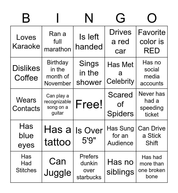 This bingo card has a free space and 24 words: Has a tattoo, Can Juggle, Sings in the shower, Has Had Stitches, Favorite color is RED, Loves Karaoke, Dislikes Coffee, Ran a full marathon, Scared of Spiders, Is Over 5'9", Has Met a Celebrity, Wears Contacts, Has Sung for an Audience, Can Drive a Stick Shift, Birthday in the month of November, Has no siblings, Never has had a speeding ticket, Is left handed, Has no social media accounts, Can play a recognizable song on a guitar, Has had more than one broken bone, Has blue eyes, Drives a red car and Prefers dunkin over starbucks.