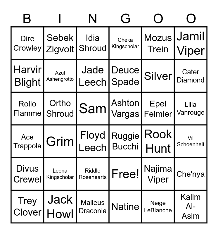 This bingo card has 36 words: Free!, Riddle Rosehearts, Natine, Harvir Blight, Ace Trappola, Ashton Vargas, Azul Ashengrotto, Malleus Draconia, Mozus Trein, Najima Viper, Cater Diamond, Cheka Kingscholar, Che'nya, Ortho Shroud, Deuce Spade, Dire Crowley, Divus Crewel, Epel Felmier, Rollo Flamme, Idia Shroud, Sam, Grim, Ruggie Bucchi, Floyd Leech, Rook Hunt, Sebek Zigvolt, Silver, Jack Howl, Jade Leech, Jamil Viper, Kalim Al-Asim, Trey Clover, Vil Schoenheit, Lilia Vanrouge, Leona Kingscholar and Neige LeBlanche.
