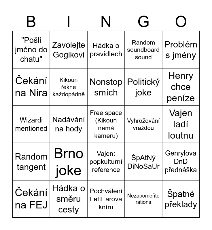This bingo card has a free space and 39 words: Nikdo nechce dělat reacap, Sexual joke, "Teď seriozně", Kikoun řekne každopádně, Čekání na FEJ, Vajen: popkulturní reference, Nonstop smích, Kikoun řekne anyway, Problém s jmény, Random tangent, Nadávání na hody, Random soundboard sound, Špatné překlady, Vajen ladí loutnu, Vyhrožování vraždou, Brno joke, Silah odpovídá mlčením, "Pošli jméno do chatu", Kory křící, ŠpAtNý DiNoSaUr, Čekání na Nira, Pochválení LeftEarova kníru, Politický joke, Henry chce peníze, "Co máš proti židům?", Foundry problémy, "Kdy budeme končit?", Močík pauza, Upravená jména, Zavolejte Gogikovi, Niro vaří, Jezení při sessionu, Hádka o pravidlech, Hádka o směru cesty, Nezapomeňte rations, Rozplývání se nad nat 20, Genrylova DnD přednáška, Wizardi mentioned and Koryho otázky.
