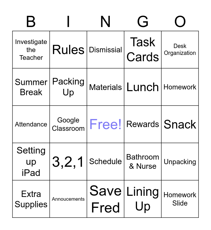 This bingo card has a free space and 24 words: 3,2,1, Annoucements, Materials, Extra Supplies, Desk Organization, Investigate the Teacher, Summer Break, Rules, Rewards, Schedule, Lunch, Attendance, Bathroom & Nurse, Unpacking, Packing Up, Lining Up, Snack, Dismissial, Homework, Google Classroom, Homework Slide, Setting up iPad, Task Cards and Save Fred.