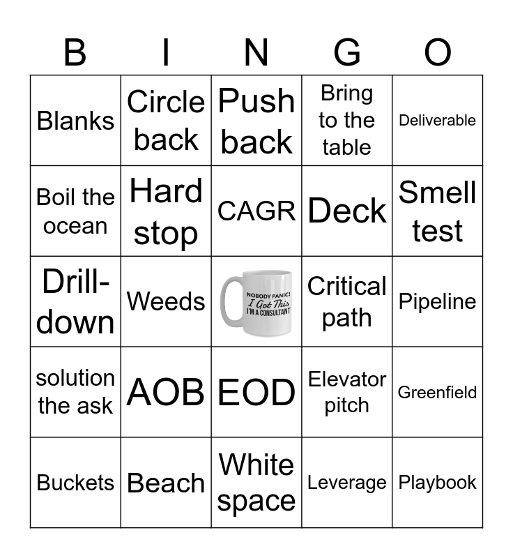 This bingo card has a free space and 24 words: AOB, Beach, CAGR, Buckets, Deliverable, Blanks, Boil the ocean, Circle back, Critical path, EOD, Deck, Drill-down, Elevator pitch, Greenfield, Hard stop, Leverage, Pipeline, Push back, Smell test, Weeds, Playbook, solution the ask, Bring to the table and White space.