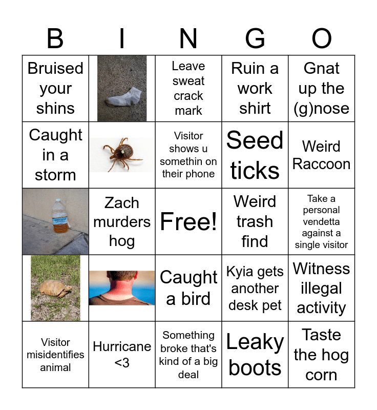 This bingo card has 5 images, a free space and 19 words: Hurricane <3, Visitor shows u somethin on their phone, Visitor misidentifies animal, Gnat up the (g)nose, Bruised your shins, Caught in a storm, Weird trash find, Caught a bird, Seed ticks, Kyia gets another desk pet, Witness illegal activity, Leaky boots, Take a personal vendetta against a single visitor, Leave sweat crack mark, Weird Raccoon, Zach murders hog, Taste the hog corn, Ruin a work shirt and Something broke that's kind of a big deal.
