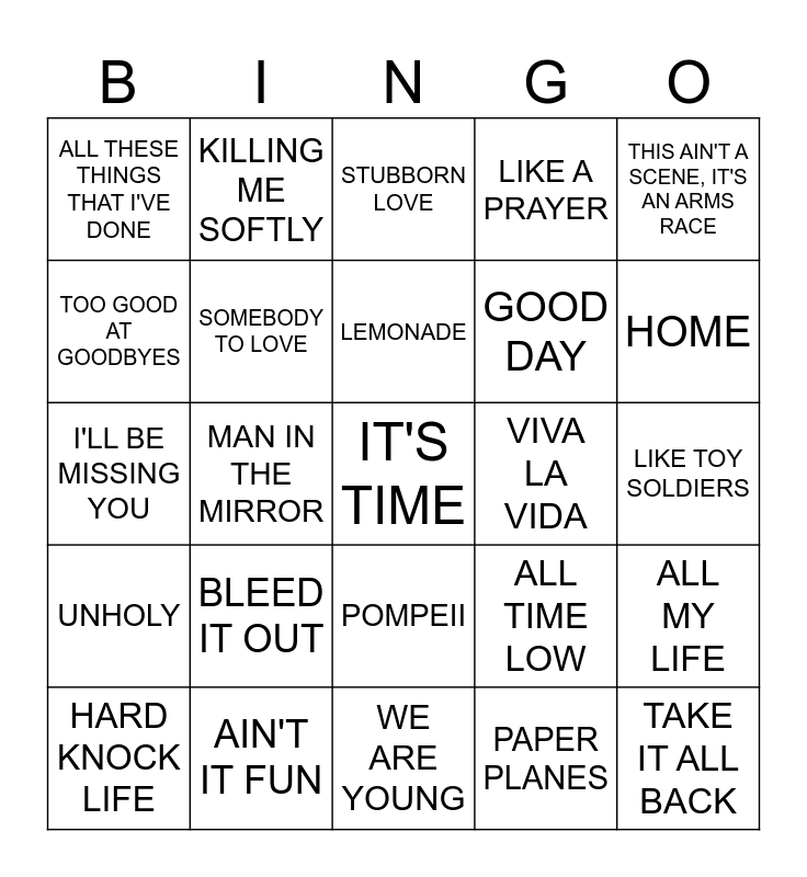 This bingo card has 30 words: AIN'T IT FUN, DEFYING GRAVITY, MAN IN THE MIRROR, THE SHOW GOES ON, ALL THESE THINGS THAT I'VE DONE, STUBBORN LOVE, SOMEBODY TO LOVE, POMPEII, VIVA LA VIDA, WE ARE YOUNG, LIKE TOY SOLDIERS, IT'S TIME, PAPER PLANES, TAKE IT ALL BACK, HOME, GLORIOUS, ALL TIME LOW, UNHOLY, BLEED IT OUT, THIS AIN'T A SCENE, IT'S AN ARMS RACE, I'LL BE MISSING YOU, ALEXANDER HAMILTON, KILLING ME SOFTLY, GOOD DAY, TOO GOOD AT GOODBYES, LIKE A PRAYER, ALL MY LIFE, HARD KNOCK LIFE, LEMONADE and I'M A THUG.