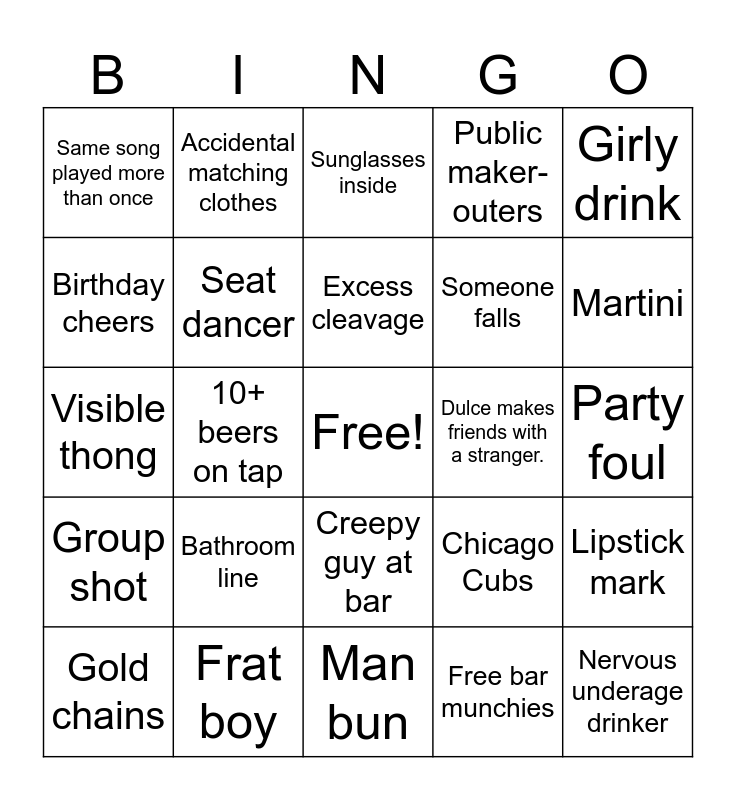 This bingo card has a free space and 27 words: Chicago Cubs, Dulce or Lauren sing, Someone falls, Man bun, Birthday cheers, Sunglasses inside, Accidental matching clothes, Group shot, Dulce makes friends with a stranger., Lipstick mark, Visible thong, Public maker-outers, Gold chains, Frat boy, Martini, Selfie with bartender, Seat dancer, Excess cleavage, Bathroom line, Same song played more than once, Party foul, Free bar munchies, 10+ beers on tap, Nervous underage drinker, Creepy guy at bar, Girly drink and Beer flight.